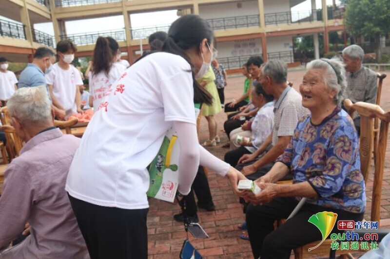 图为实践队员给敬老院的老人们分发水果和牛奶。中国青年网通讯员 邓召坪供图