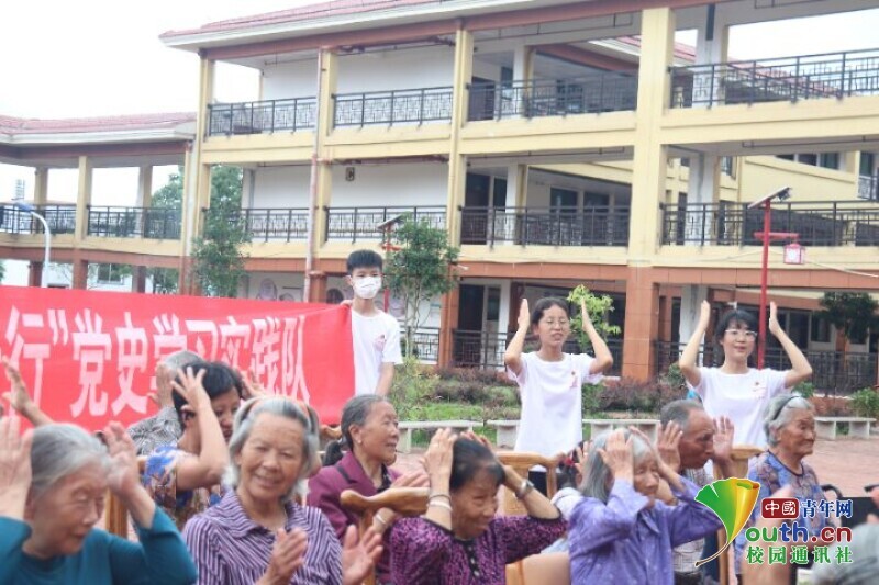 中国青年网于都7月8日电(通讯员 苏瑶)为弘扬中华民族敬老爱老的传统美德,7月4日,江西师范大学化学化工学院“铭记党史于心,迎二十大于行”暑期“三下乡”党史学习实践团前往岭背镇光荣敬老院,开展“爱在征途,携手共进”敬老院之行。进入敬老院,实践队员给老人们分发水果和牛奶,和老人们亲切交谈,热心帮助老人剥玉米,整理床铺、打扫卫生,询问老人身体健康,并教老人做手势操。