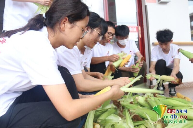 图为实践队员热心帮助老人们剥玉米。中国青年网通讯员 邓召坪 供图