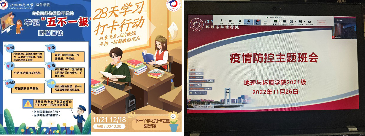 各学院积极开展网络思想政治教育,引导学生增强防护意识,树立防疫信心。地理与环境学院积极开展线上主题班会、思政课堂等活动,将疫情防控宣传与思想政治教育相结合,上好疫情防控这场“大思政课”,做学生成长路上的引路人;软件学院积极开展防电信网络诈骗教育和28天学习打卡行动,引导学生养成健康学习、生活习惯。