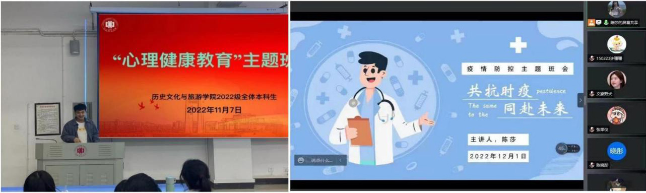 全体学工干部密切关注学生的思想动态,通过多渠道了解学生需求,积极开展心理辅导,提高学生心理素质和思想素质。历史文化与旅游学院积极开展线上线下“心理健康教育”主题班会;美术学院搭建“院-班-寝”三级心理预警机制,及时干预学生心理异常情况。