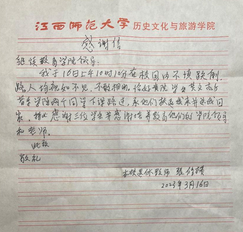 张修楼在感谢信中写道:“我在校园内不慎跌倒。恰好贵院学生黄文杰与音乐学院两个同学下课路过,承他们扶起我来并送我回家。”