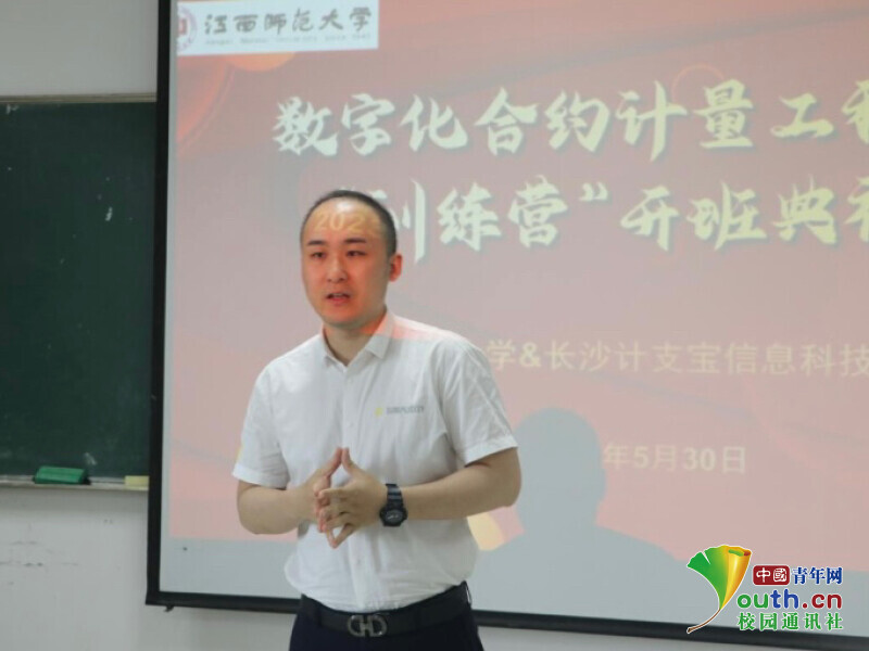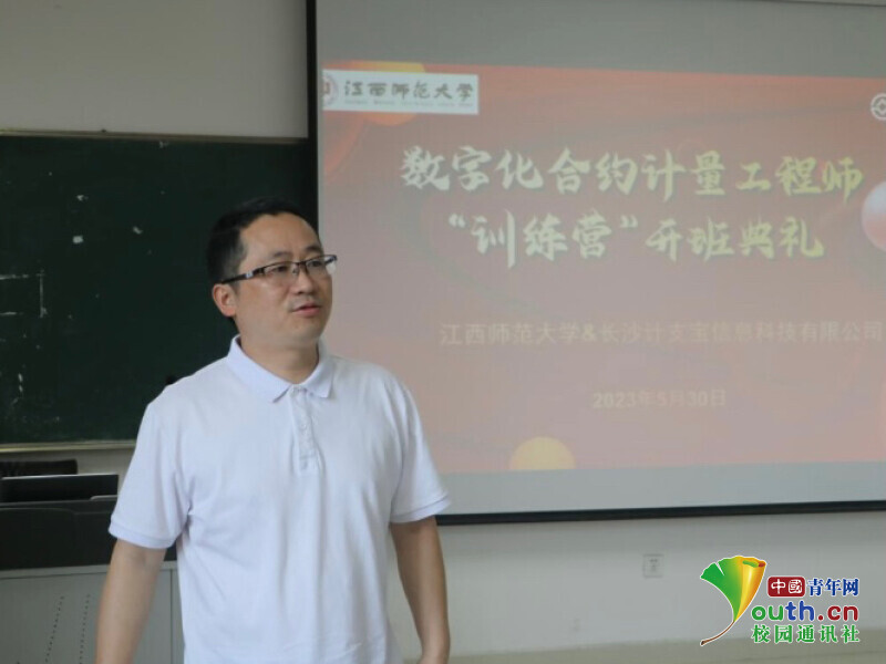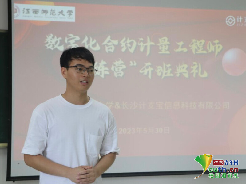 中国青年网南昌5月30日电(通讯员 颜逸 夏雨慧 项欣悦)为贯彻落实党中央、国务院“稳就业”“保就业”决策部署,深化产教融合、校企合作,推动人才培养与就业有机联动、人才供需有效对接,2023年5月30日上午,由长沙计支宝科技信息有限公司与城市建设学院共建的教育部供需对接就业育人项目——江西师范大学“数字化合约计量人才培养”特色班开班仪式在实验大楼北306教室如期进行,城市建设学院副院长范正根、工程管理与房地产系主任刘章生、计支宝公司研究院区域负责人谭远洋、研究院工程师周博文以及工程管理特色班学员共同参加,特色班负责人兼副系主任刘桂海主持仪式。