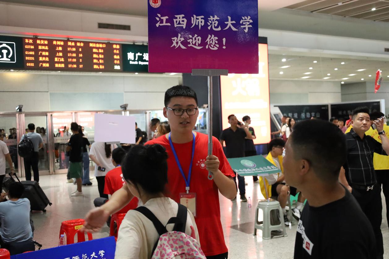 天南海北的列车停靠在南昌,人潮汹涌、摩肩接踵。上午10点左右,出站口人流逐渐增多,抵达南昌的新生与家长在陌生的出站口处徘徊,眼神久久地搜寻着,直到看到高高举起的“江西师范大学欢迎你”指引牌。