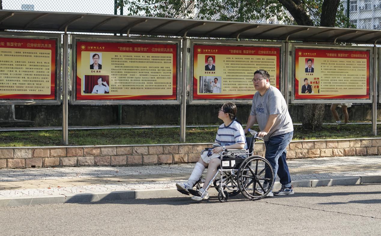 新生报到的这一天,记者捕捉到这样一张照片:父女俩一起参观师大校园,女儿因腿受伤坐在轮椅上,看着宣传栏中一位位优秀教师的事迹,眼中闪着向往的光。据了解,女孩是2023级历史学类的公费师范生王晶,因意外腿受伤尚在康复期,入学的第一天一家人陪着她坐着轮椅报到。