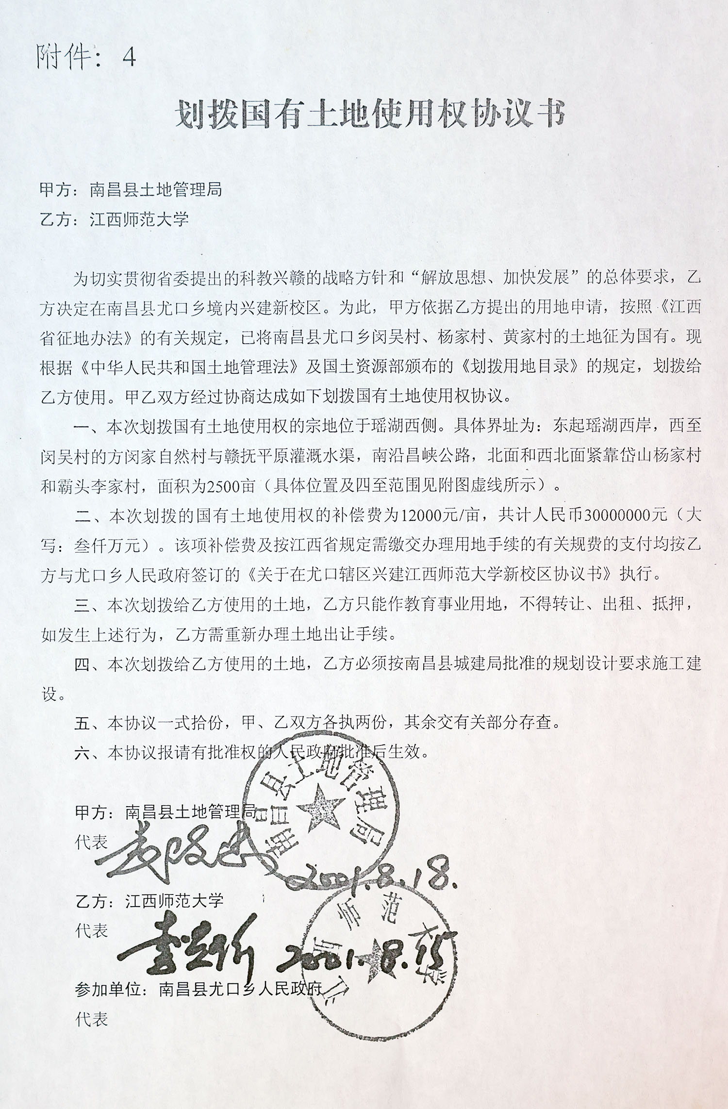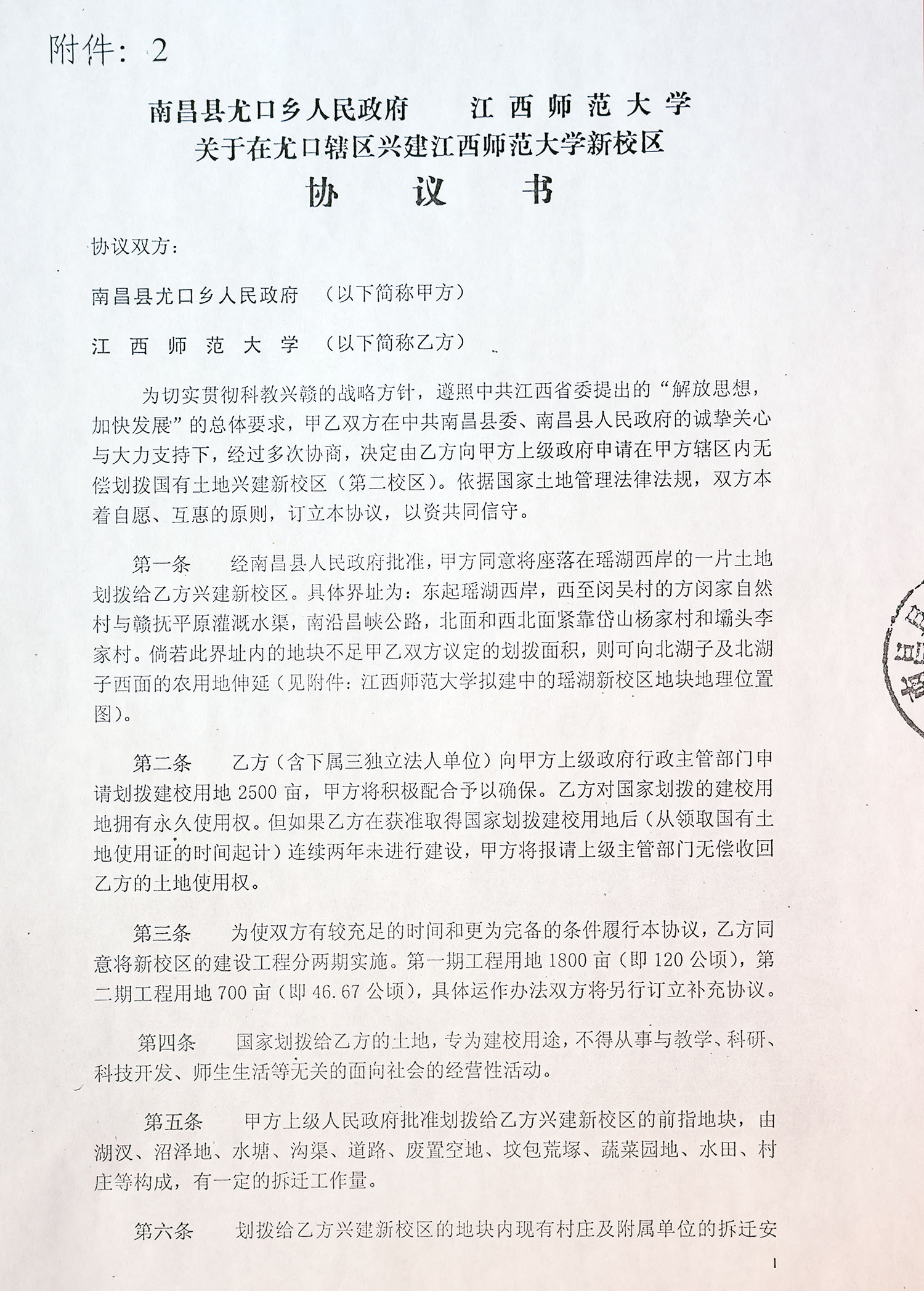 我校当时与南昌县尤口乡签订的瑶湖校区建设协议书