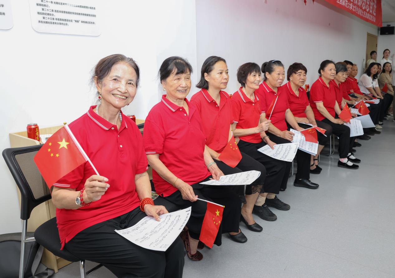 伴随着“幸福大妈合唱团”高亢的歌声,实践队员以指挥、领唱和钢伴等方式,组织开展了“宣讲团+合唱团,共筑时代强音”主题活动。“我和我的祖国,一刻也不能分割......”青年的活力和老年的沉稳交相辉映,道不尽爱国情深,看着每一位爷爷奶奶的脸上荡漾着灿烂笑容,队员们也真切感受到社区文化建设的“趣缘”发展、充盈丰沛。