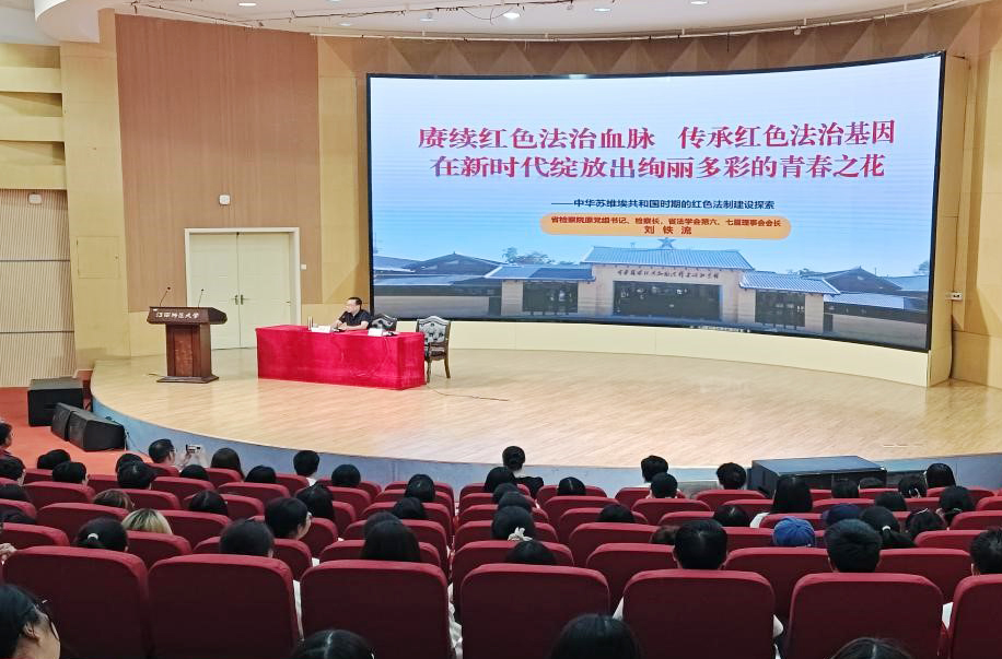 刘铁流以“赓续红色法治血脉 传承红色法治基因 在新时代绽放出绚丽多彩的青春之花——中华苏维埃共和国时期的红色法制建设探索”为题,结合其深厚的理论功底和丰富的实践经验,从主要成就、历史地位、时代价值等方面,深入浅出地讲述了中华苏维埃共和国法制建设的伟大历程和艰辛探索,并寄语同学们要博览群书、博采众长、重在求是、贵在有恒,把崇德修身作为成事之基和力量之源,扣好人生的第一粒扣子,努力成为一名正直无私、坚持法律信仰、不为功利所左右的法律人,在中国式现代化法治实践中绽放绚丽的青春光芒。