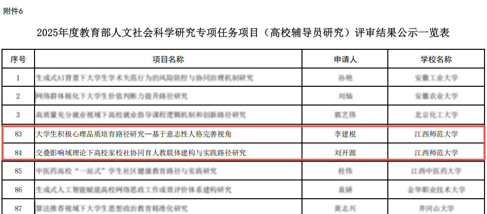近日,教育部社科司2025年度教育部人文社会科学研究专项任务项目(高校辅导员研究)立项结果公布。我校物理与通信电子学院辅导员李建根、新闻与传播学院辅导员刘开源申报的项目双双获批立项。