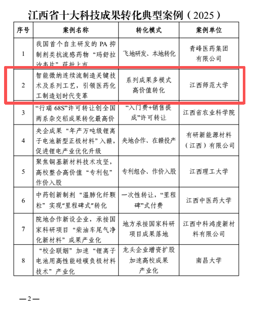 近日,江西省科学技术厅发布了2025年十大科技成果转化典型案例,校长陈芬儿院士领衔的研发团队“智能微纳连续流制造关键技术及系列工艺,引领医药化工制造划时代变革”项目成功入选。