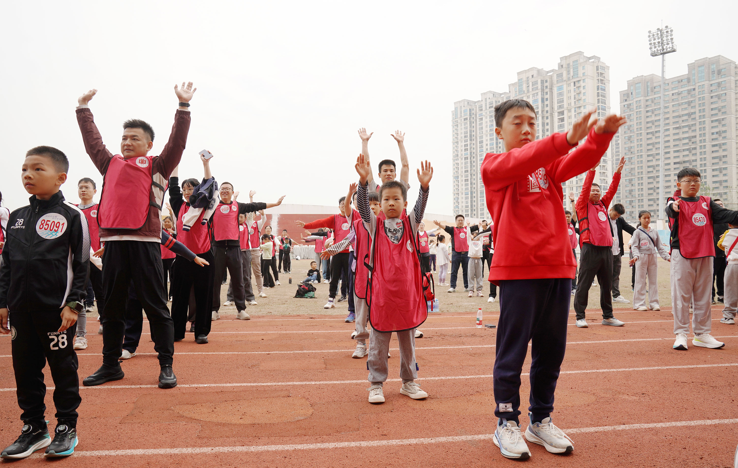 体育学院的志愿者们在活动前带领参加活动的校友、师生们开展专业热身