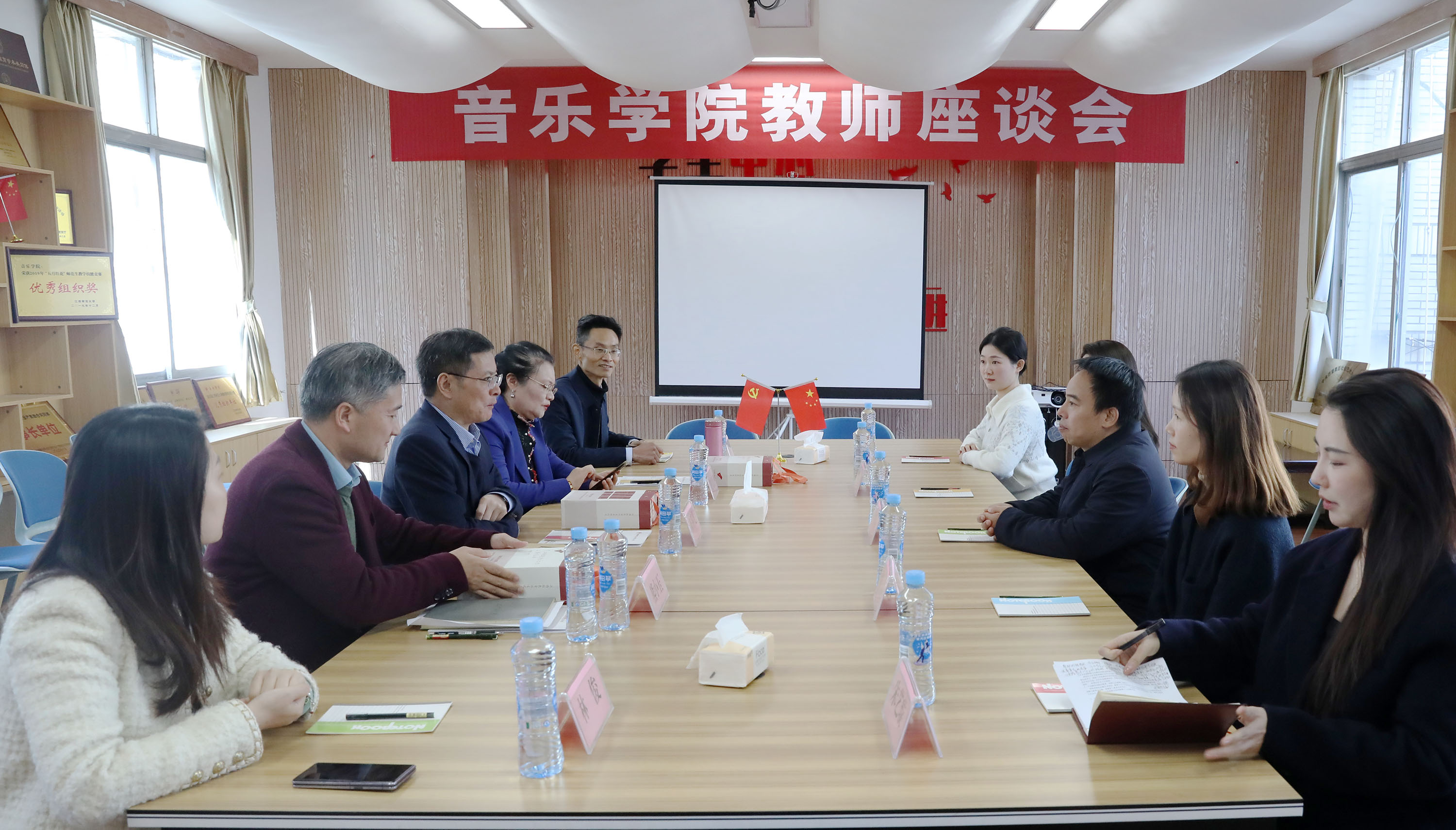 宣讲会后,陈芬儿、姚弋霞与音乐学院教师代表座谈,围绕人才培养、学科建设、两校区办学、软硬件设施改善、高质量科研等议题深入交流,回应师生关切、探讨解决方案,为学院发展精准施策。