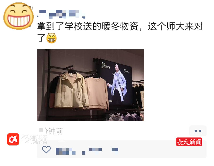 “收到学校的防寒物资,我十分的感动。一开始,我本以为学校发放的物资会简单些,但没想到它给了我一个惊喜,品牌服装说给就给,让我不由得对学校更增添了喜爱和敬仰,更让我的内心增添了冬天里别样的温暖。”邢同学说道。