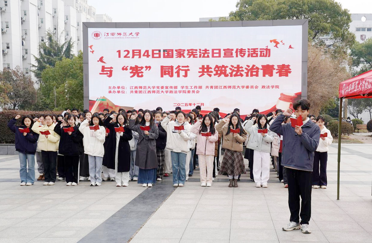 12月4日,由我校、江西省高级人民法院、南昌市青山湖区人民法院共同主办的“12.4”国家宪法日系列宣传活动在青年文化广场启动,校党委常委、副校长董圣鸿,党委常委、宣传部部长王一喜及相关部门、学院负责人与师生一同参与宪法宣誓、体验宪法问答、宪法词条互动等活动。