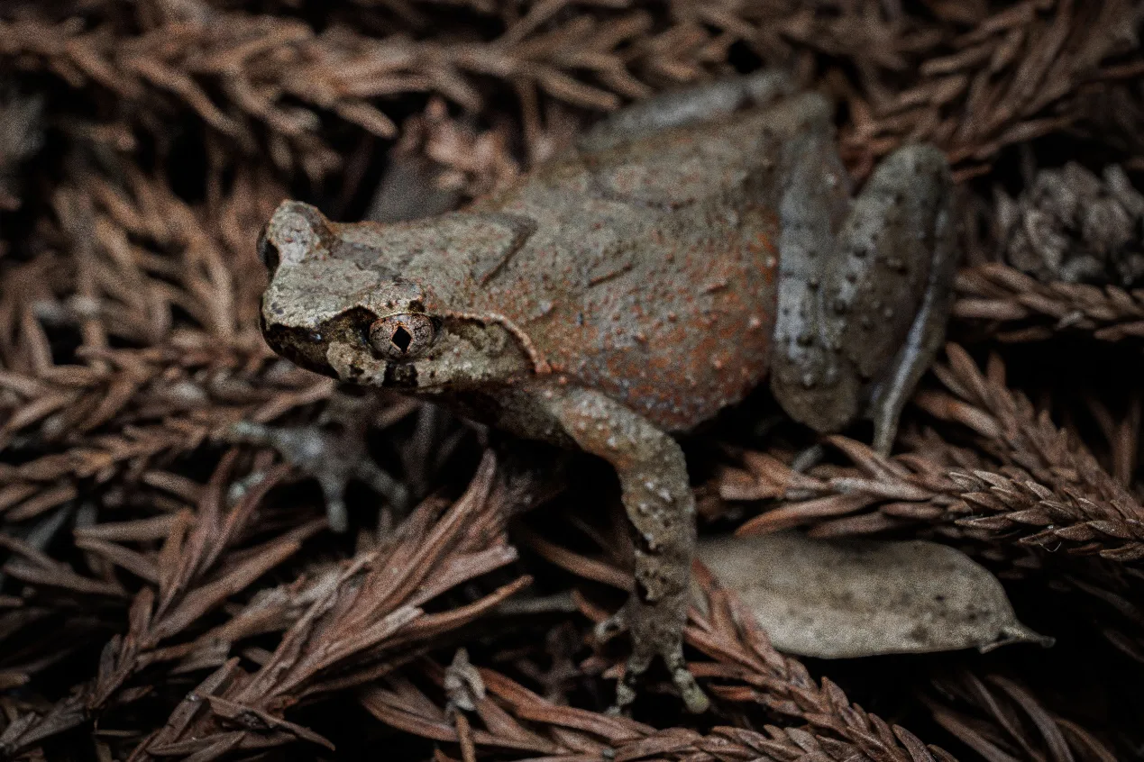 图为云雾角蟾匍匐在庐山高海拔针阔混交林的落叶上。