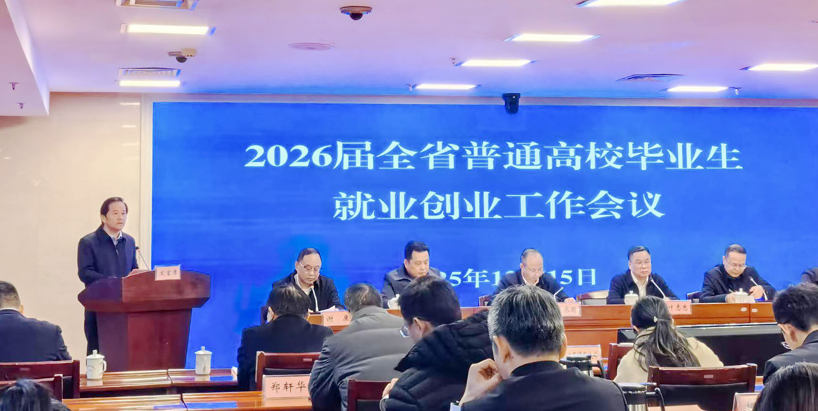 12月15日,省委教育工委、省教育厅、省人力资源和社会保障厅、省国资委、省工信厅联合召开2026届全省普通高校毕业生就业创业工作视频会议,省委教育工作领导小组秘书组组长、省委教育工委书记吴永明出席并讲话,省教育工委委员、省教育厅总督学谢康主持会议。校党委书记朱小理作为全省本科院校唯一代表在主会场作经验交流发言。学校分管就业工作校领导、就业工作领导小组成员单位、各学院主要负责人和全体毕业班辅导员在学校分会场参加会议。