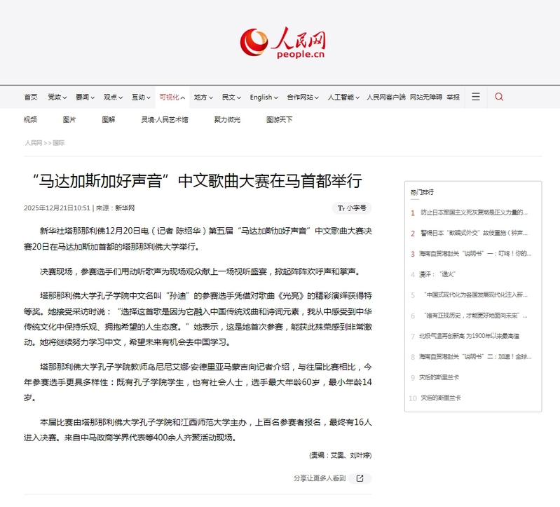 新华社塔那那利佛12月20日电(记者 陈绍华)第五届“马达加斯加好声音”中文歌曲大赛决赛20日在马达加斯加首都的塔那那利佛大学举行。
