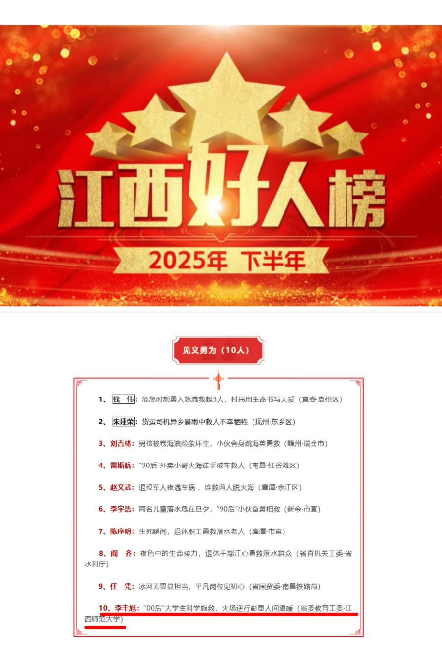 近日,江西省文明办发布2025年下半年“江西好人”名单,我校体育学院2023级运动训练专业李丰旭同学获评见义勇为类“江西好人”,这是我校师生连续三年获评“江西好人”称号。
