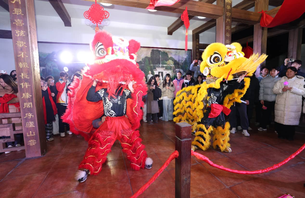 现场气氛热烈,朱小理、陈芬儿手持画笔,为雄狮点睛,寓意唤醒祥瑞、开启吉祥。气势恢宏的舞狮表演增添了浓厚的喜庆氛围,伴着《欢乐中国年》的旋律,全场师生齐声合唱,将新年的喜悦与期盼传递到校园的每一个角落。
