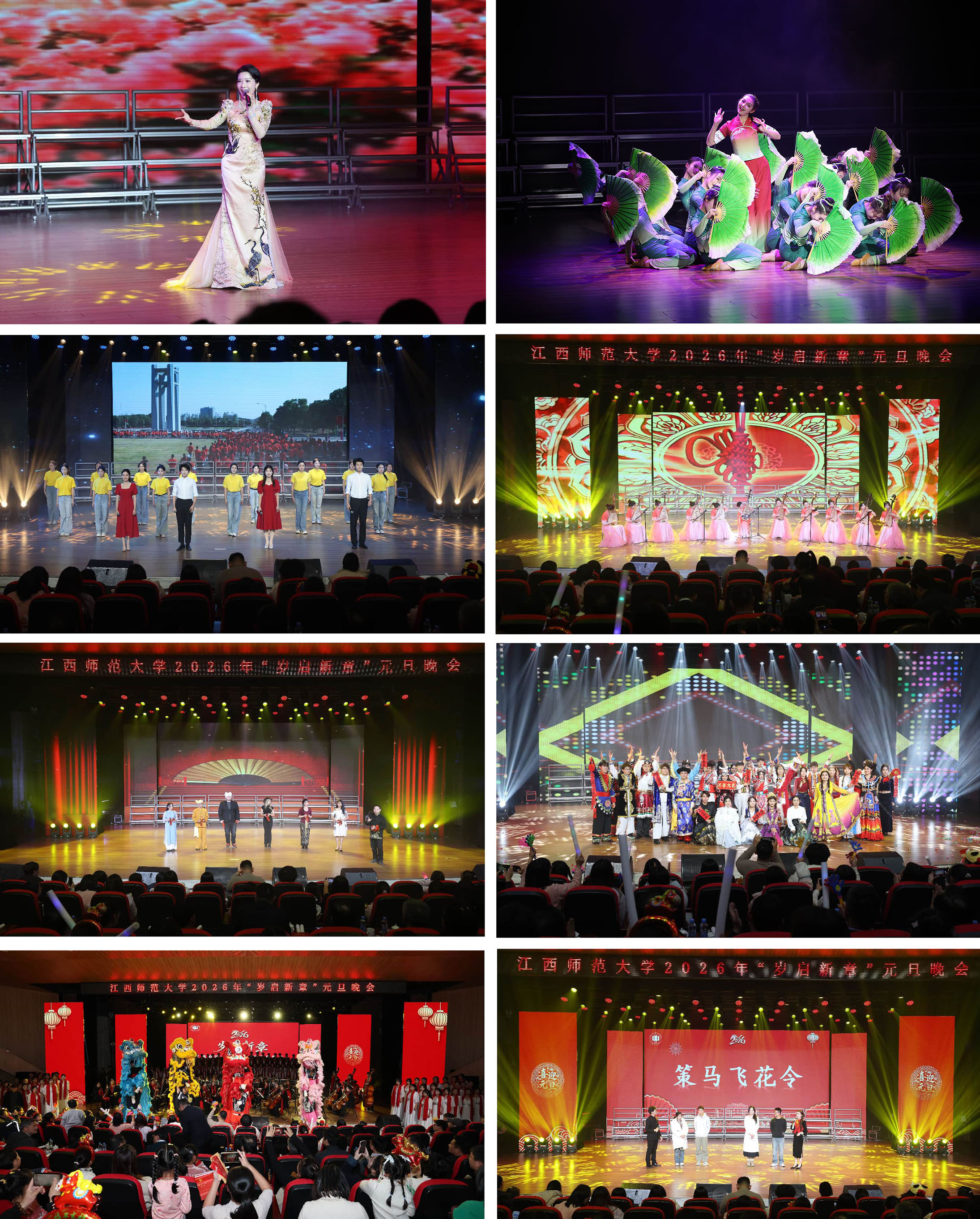 晚会在音乐学院青蓝交响乐团带来的《星辰大海》和《红色娘子军》气势磅礴的乐声中拉开帷幕,激昂的旋律瞬间点燃全场。整场演出节目丰富、形式多样。女声独唱《越来越好》婉转动听,唱出了对新年的美好愿景;《节日欢歌》舞姿优美,将传统舞蹈的喜庆韵律与新年的热闹氛围完美交融;朗诵《闪耀吧 青春》用铿锵有力的话语展现了青春的模样,传达了师大学子的热血与担当;《我的入党志愿书》让观众在歌声中重温那份跨越时空的庄严承诺。留学生们带来曲艺快板《唱南昌》,快板声声节奏明快,尽展地方民俗特色;在《同心石榴籽·筑梦中华情》中,各民族学子身着民族特色服饰,诠释民族一家亲;交响合唱《在灿烂阳光下》,奏响了对未来的美好期盼。全场齐声合唱《歌唱祖国》,激昂旋律响彻会场,在热烈的掌声中,晚会正式落下帷幕。