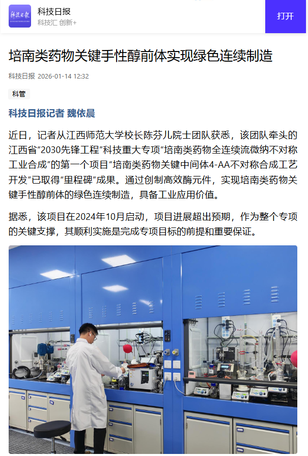 近日,记者从江西师范大学校长陈芬儿院士团队获悉,该团队牵头的江西省“2030先锋工程”科技重大专项“培南类药物全连续流微纳不对称工业合成”的第一个项目“培南类药物关键中间体4-AA不对称合成工艺开发”已取得“里程碑”成果。通过创制高效酶元件,实现培南类药物关键手性醇前体的绿色连续制造,具备工业应用价值。