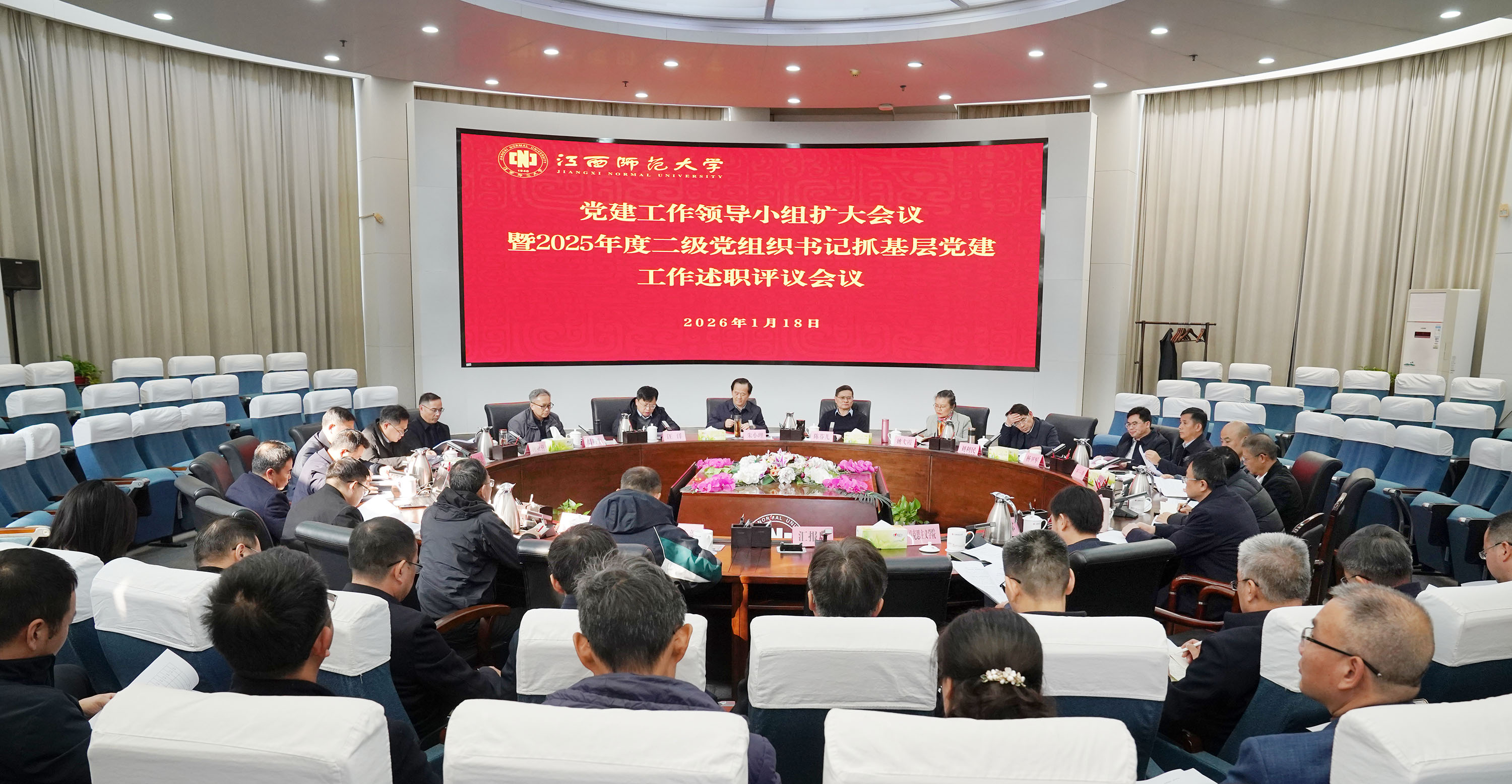 1月18日,学校在知行楼水晶厅召开党建工作领导小组扩大会议暨2025年度二级党组织书记抓基层党建工作述职评议会议。校党委书记朱小理,校长陈芬儿院士,在校党政班子成员姚弋霞、周利生、刘利民、钟业喜、杨卫军、郭亮亮、王一喜出席,校党建工作领导小组成员单位主要负责人,各二级党组织书记以及基层党员代表参加。会议由校党委副书记汪洋主持。