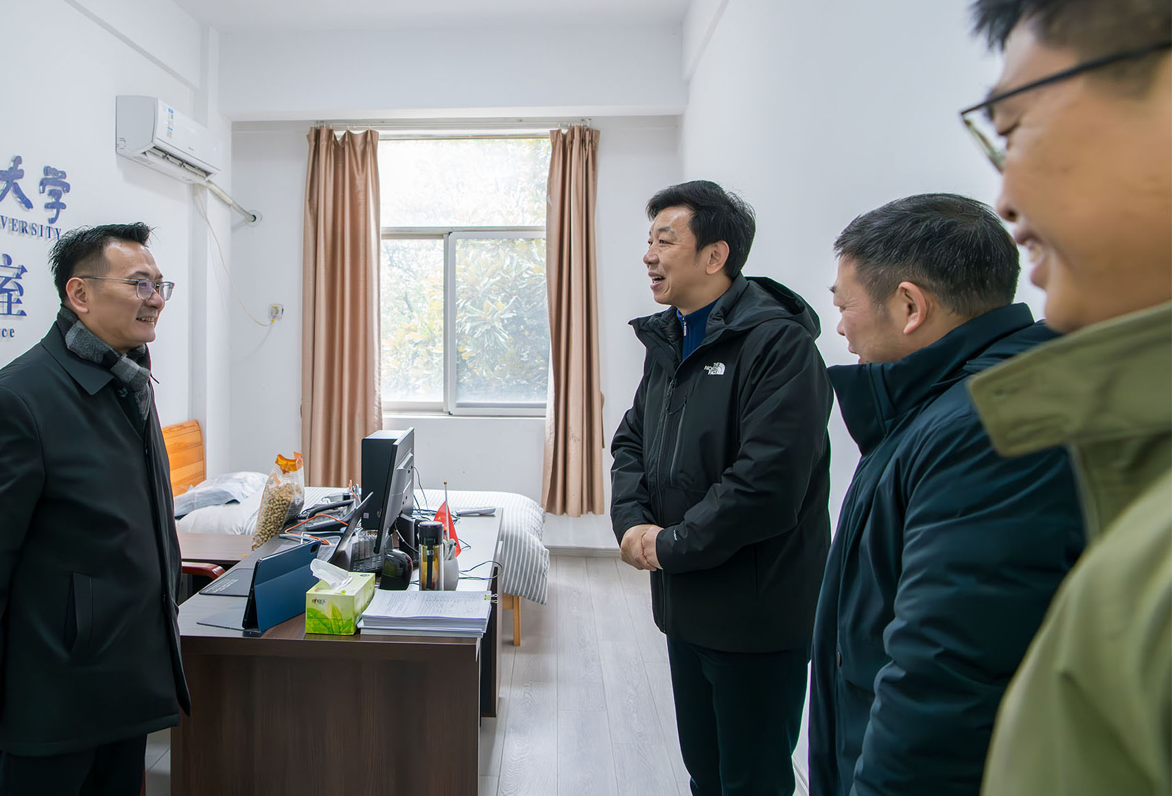 董圣鸿先后深入保卫处、学校总值班室、校医院、瑶湖校区高压配电间、白鹿会馆等地,实地察看假期校园运行保障情况,为坚守一线的教职员工送上慰问品,对他们舍小家为大家、恪尽职守的奉献精神给予肯定并表达感谢。他仔细询问了寒假期间校园安全保卫、供暖供电保障、餐饮服务供给、医疗应急值守等各项工作的落实推进情况,要求相关单位要提高政治站位,强化责任担当,以“时时放心不下”的责任感,筑牢校园安全防线,做优做细后勤服务保障,用贴心举措、暖心行动,精心保障全校师生度过一个平安、祥和、温暖、有序的新春佳节。