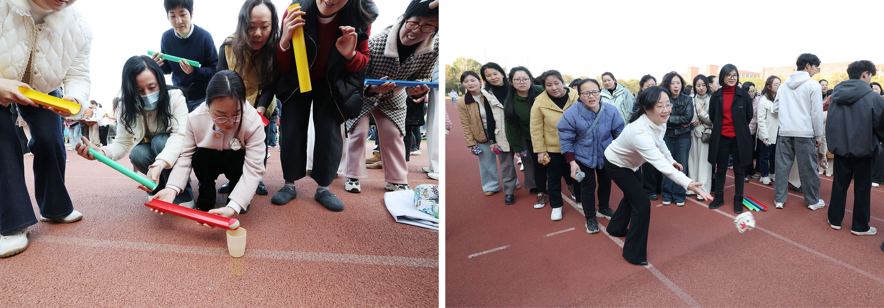 伴随着舒缓悠扬的音乐,女教职工们整齐列队,凝神静气,缓缓起势,在运动场上集体进行八段锦热身。本次运动会设“马到成功”和“跃马掷彩”两个集体项目。比赛过程中,各队队员团结协作、默契配合,赛场边呐喊声、助威声、快门声此起彼伏。大家相互鼓劲,现场气氛轻松热烈。