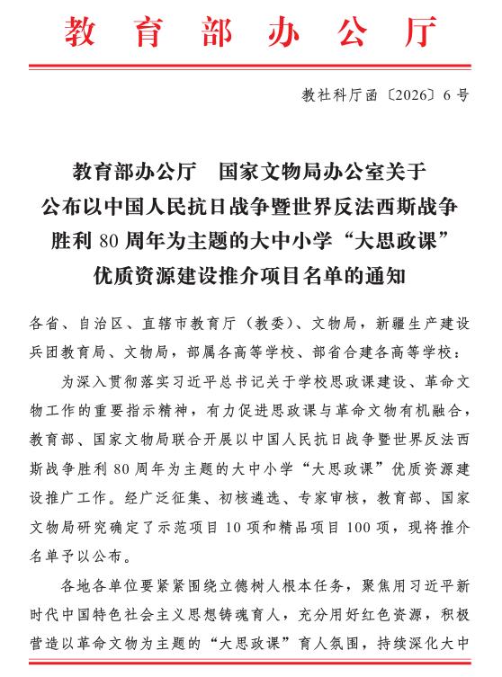 该项目由教育部、国家文物局联合组织开展,旨在深入贯彻落实习近平文化思想和习近平总书记关于革命文物工作、学校思政课建设的重要论述精神,深入推进大中小学思政课一体化建设,推动革命文物特别是抗战文物资源有效赋能学校思政课教学,弘扬伟大抗战精神,将革命文物资源禀赋创造性转化为思政课教育教学的优质资源。