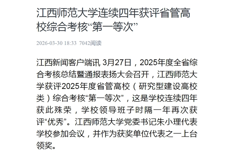 【江西新闻】江西师范大学连续四年获评省管高校综合考核“第一等次”