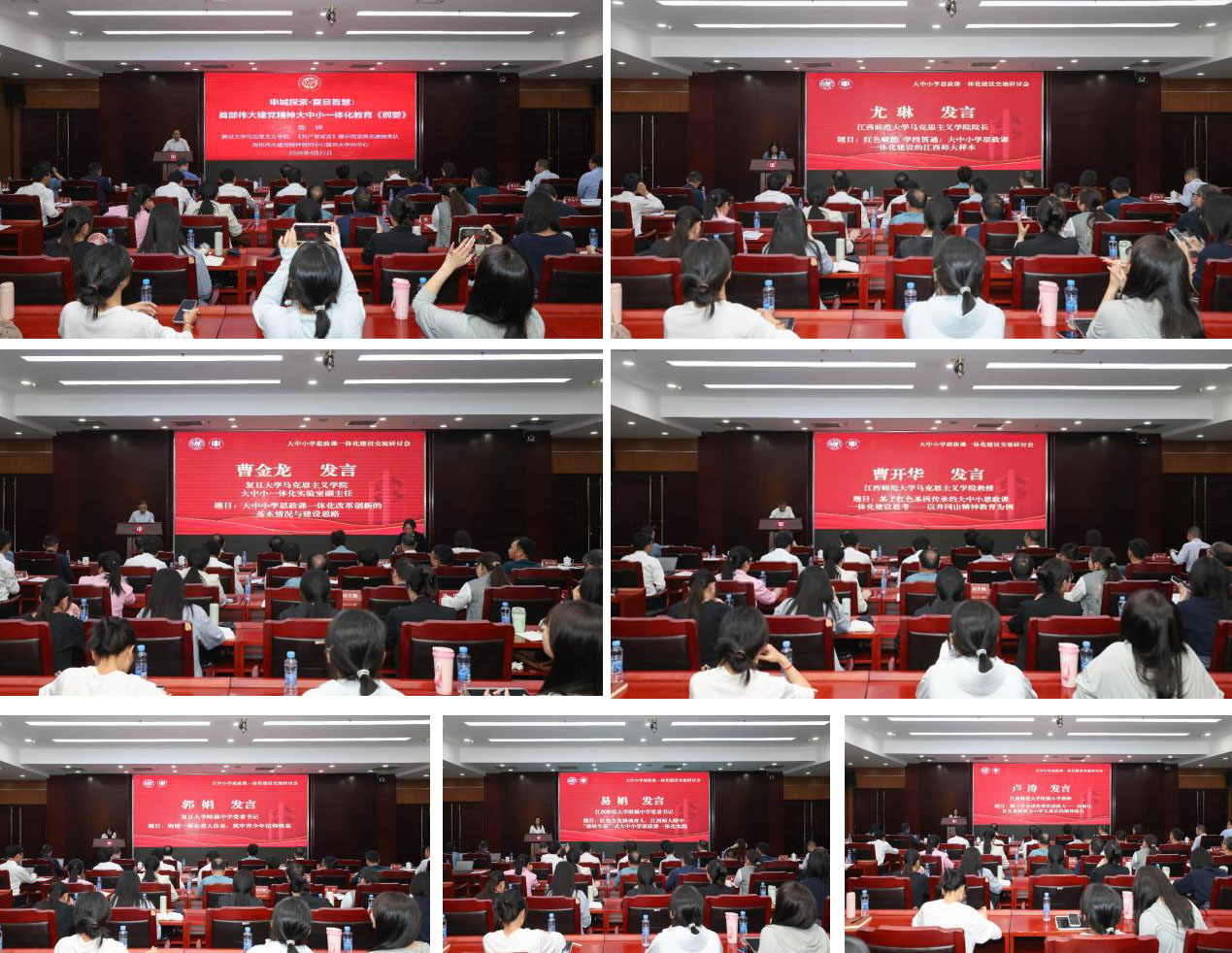 研讨交流环节,复旦大学马克思主义学院院长周晔、我校马克思主义学院院长尤琳、复旦大学马克思主义学院大中小学思政课一体化改革创新实验室副主任曹金龙、我校马克思主义学院教师曹开华、复旦大学附属中学党委书记郭娟、我校附属中学党委书记易娟、我校附属小学教师卢涛紧扣新时代思政课改革创新要求,聚焦大中小学思政课一体化建设目标,分别作主旨报告。