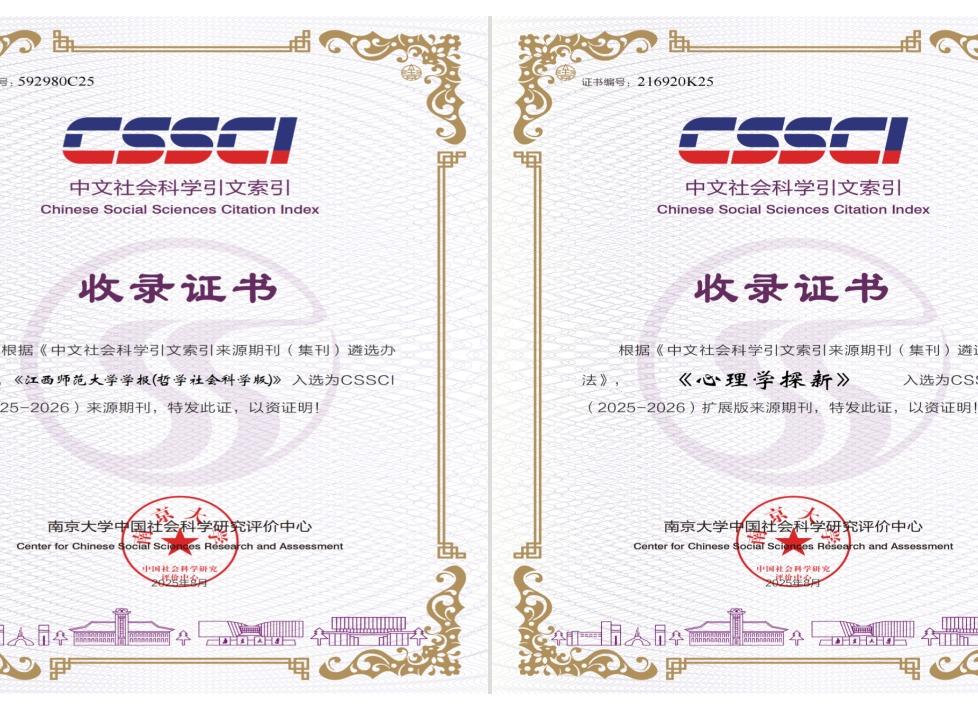 近日,根据南京大学中国社会科学研究评价中心《中文社会科学引文索引来源期刊(集刊)》数据库最新数据,由我校主办的《江西师范大学学报(哲学社会科学版)》再度入选为CSSCI(2025-2026)来源期刊,《心理学探新》再度入选为CSSCI(2025-2026)扩展版来源期刊。近年来,《江西师范大学学报(哲学社会科学版)》和《心理学探新》编辑部在学校的坚强领导下,始终坚持正确办刊方向,走内涵式发展道路,践行开门办刊理念,持续刊发高...