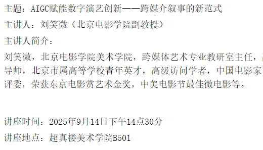 主题:AIGC赋能数字演艺创新——跨媒介叙事的新范式主讲人:刘笑微(北京电影学院副教授)主讲人简介:刘笑微,北京电影学院美术学院,跨媒体艺术专业教研室主任,副教授,影视广告导演方向硕士生导师,北京市属高等学校青年英才,高级访问学者,中国电影家协会会员,中国大学生广告节终审评委,荣获东京电影赏艺术金奖,中美电影节最佳微电影等。讲座时间:2025年9月14日下午14点30分讲座地点:超真楼美术学院B501
