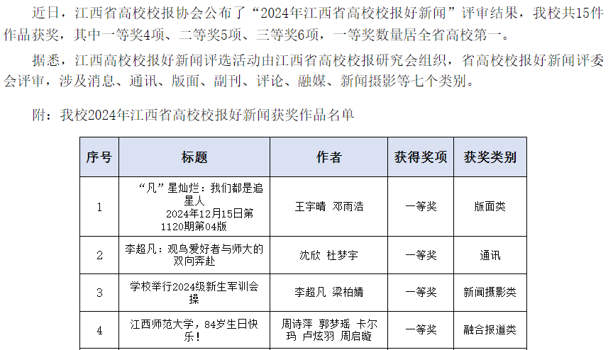 近日,江西省高校校报协会公布了“2024年江西省高校校报好新闻”评审结果,我校共15件作品获奖,其中一等奖4项、二等奖5项、三等奖6项,一等奖数量居全省高校第一。据悉,江西高校校报好新闻评选活动由江西省高校校报研究会组织,省高校校报好新闻评委会评审,涉及消息、通讯、版面、副刊、评论、融媒、新闻摄影等七个类别。附:我校2024年江西省高校校报好新闻获奖作品名单序号标题作者获得奖项获奖类别1“凡”星灿烂:我们都是追...